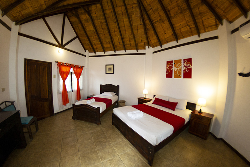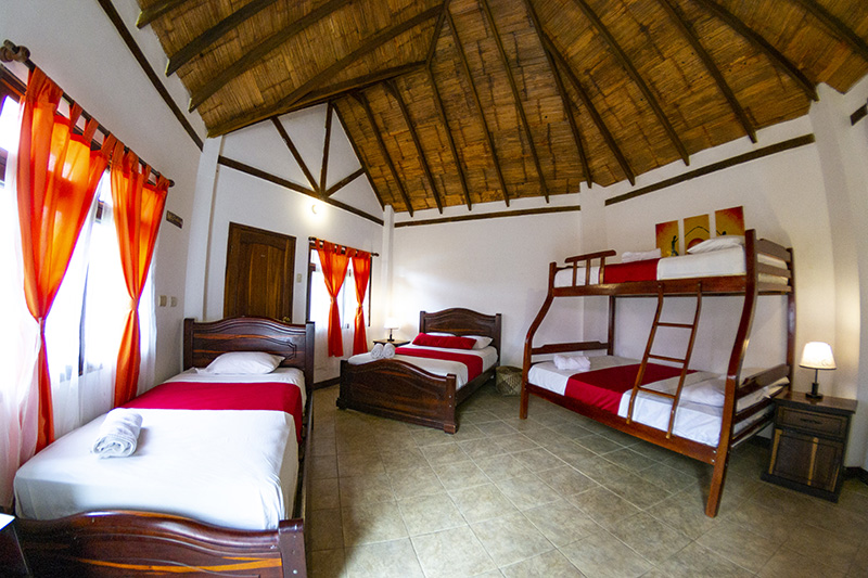 Habitación quíntuple ubicada en planta alta con vista panorámica de la hostería el mar y las montañas de Pto. López. La habitación tiene tres entornos; un cuarto pequeño privado para padres con baño interno, el segundo entorno es una pequeña sala y el tercero es otro cuarto con dos camas; una de 2 plazas y otra de 1.5 plazas con baño privado. Cada cuarto de la habitación cuenta con aire acondicionado 1200 BTU.