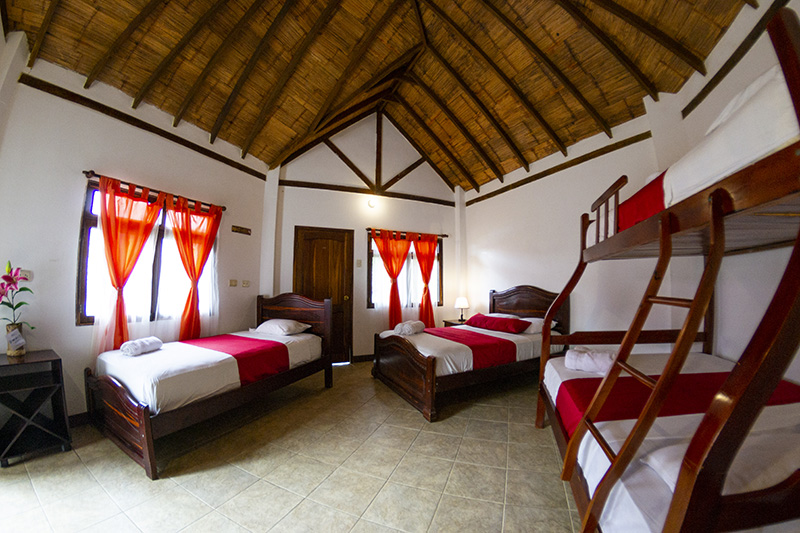 Habitación quíntuple ubicada en plantabaja con dos ambientes. Un cuarto privado para padres y otro entorno para hijos, un solo baño. Cuenta con una cama de 2 plazas y una cama litera (Parte baja de litera bajo 2 plazas, parte alta 1.5 plazas). Cada área de la habitación cuenta con aire acondicionado 1200 BTU. Además, esta habitación goza de balcón amplio privado, hamaca y hermosa vista del jardín.